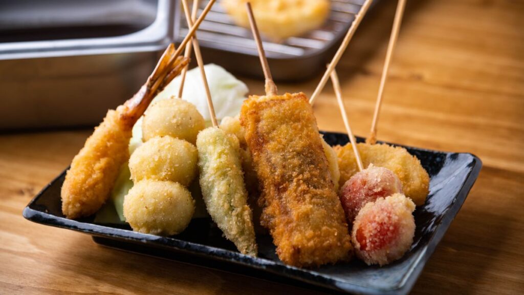 In Osaka, kushikatsu is a beloved Japanese street food centered around skewers of crunchy, breaded and deep-fried ingredients—commonly pork and vegetables (also referred to as “kushiage” as a broader category of deep-fried skewers across Japan).