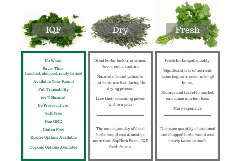 Individual Quick-Frozen (IQF) ingredients are achieved by harvesting fresh herbs or vegetables at peak ripeness, then rapidly passing through sub-zero air. This flash-freezing process gently preserves volatile flavor oils and results in free-flowing, easy-to-handle product with extended shelf-life.